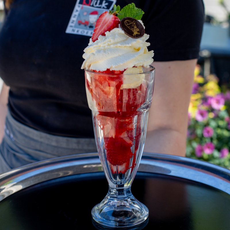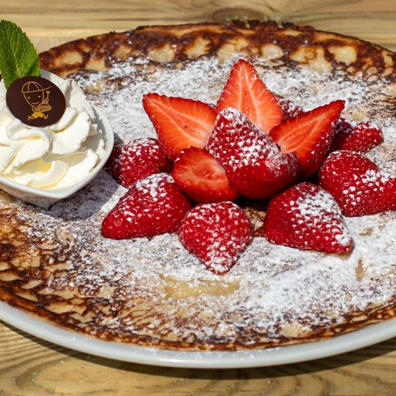 Onze pannenkoeken worden gemaakt met ambachtelijk gemalen meel van molen ‘De Ooievaar’, verse scharreleieren en melk van een lokale boer. Daarnaast gebruiken wij zoveel mogelijk verse streekproducten, zoals honing van de plaatselijke imker en huisgemaakte jam van aardbeien uit de regio.